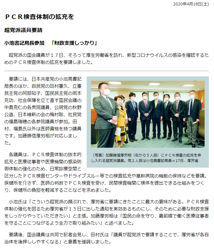 自民党・公明党・共産党他野党の国会議員が17日、そろって厚生労働省を訪れ、新型コロナウイルスの感染を確認するためのPCR検査体制の拡充を要請しました。