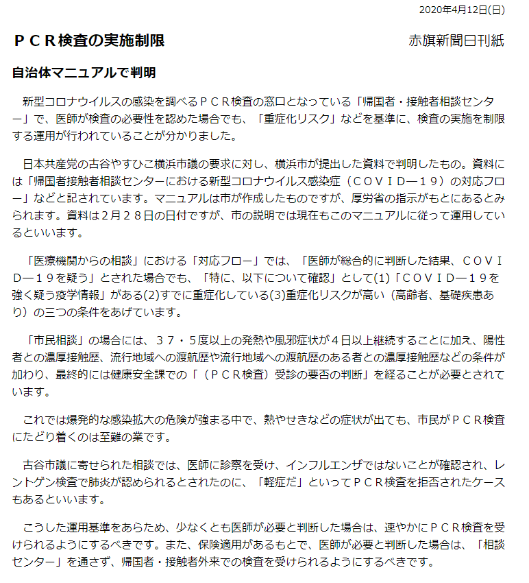 横浜他では、医師が検査の必要性を認めた場合でも「重症化リスク」などを基準に、検査の実施を制限する運用が行われていることが分かりました。