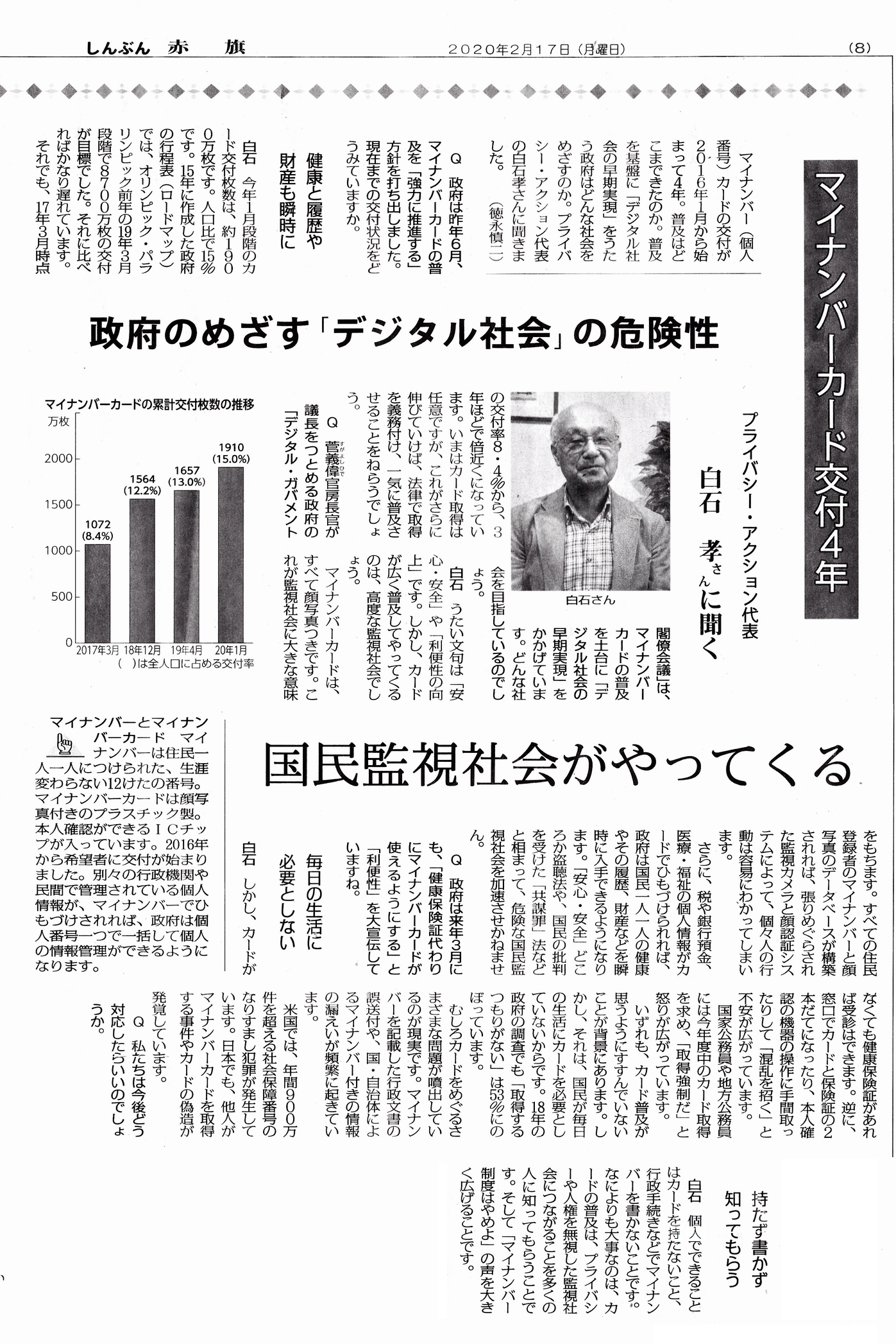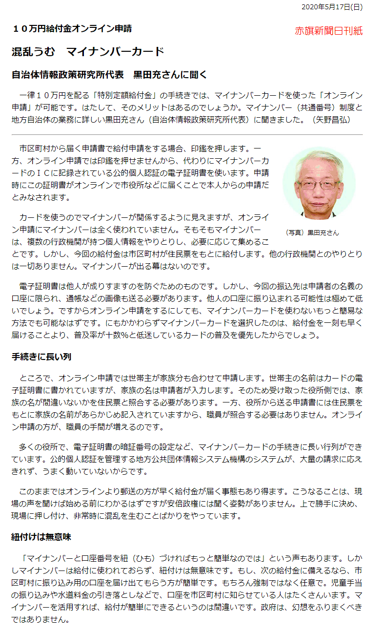 赤旗新聞 10万円給付の混乱 マイナンバーカード