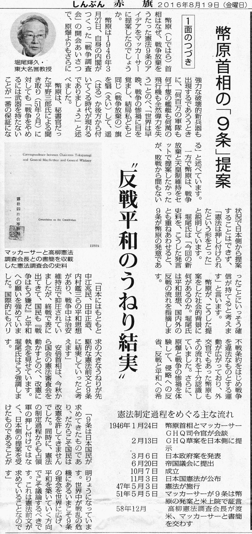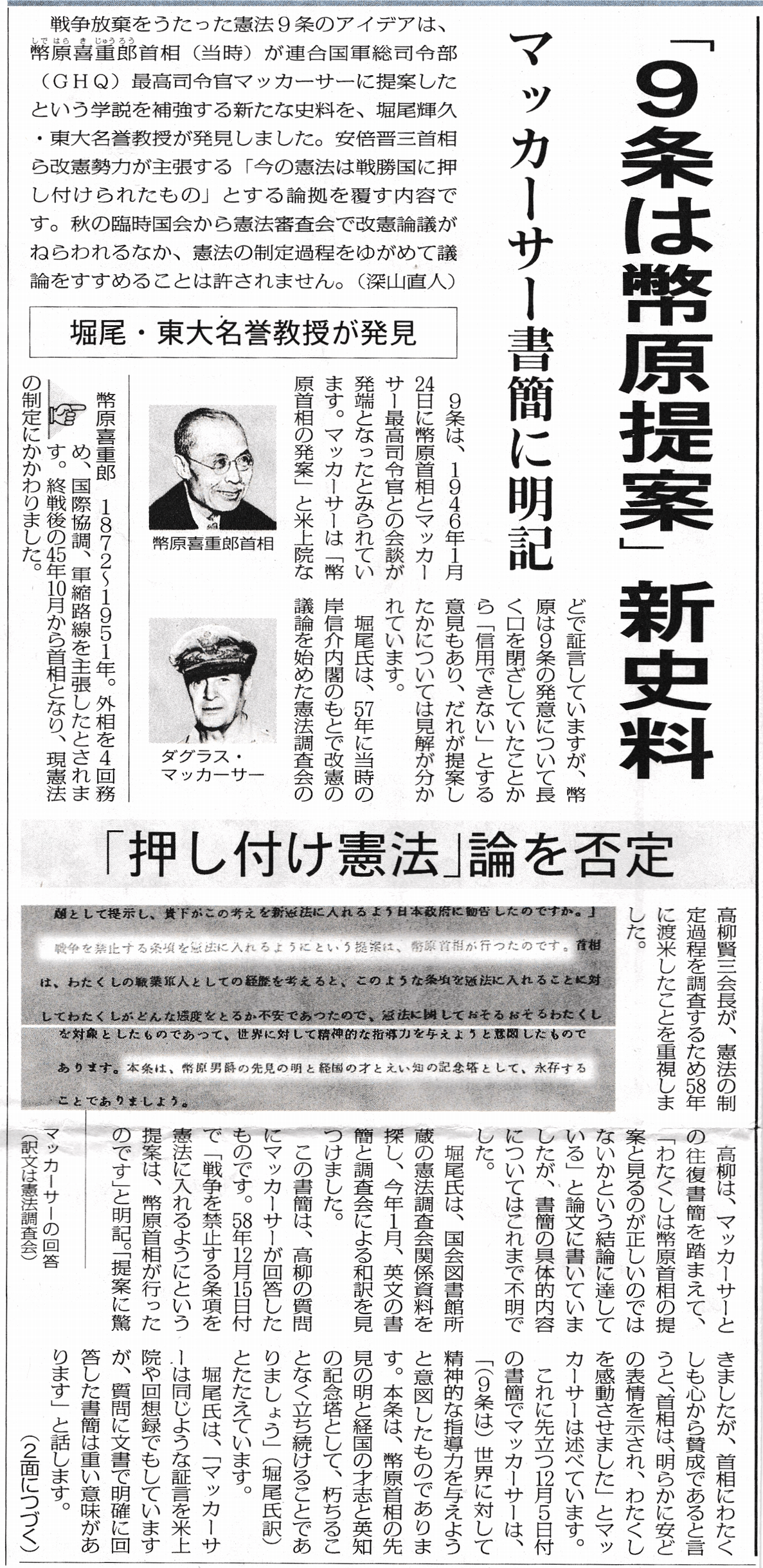 戦後当時の幣原喜重郎(しではらきじゅうろう)首相が、マッカーサーに憲法9条を提案したという学説を補強する新史料が発見されたと、報道されました。