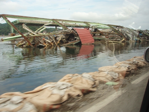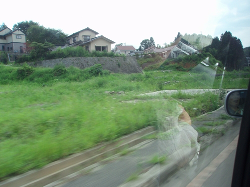 リアス式海岸の構造で、山の方まで津波がやってきて、まだらのようにえぐって行った。