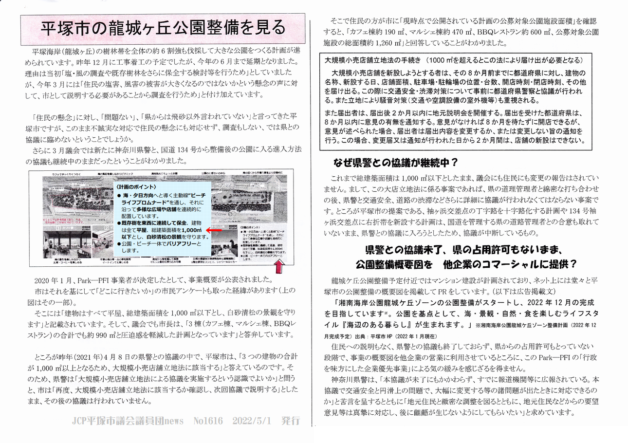 + 「平塚市に寄せられた龍城ヶ丘に関する意見は、情報公開で得た当時で7089件あり、そのうち6639件の93.6%が「樹林帯を切らないで」「見直してほしい」などの真剣な声でした。」